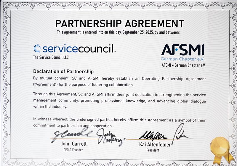 München / Boston, 25. September 2025 – Der US-amerikanische Verband The Service Council LLC und der deutsche Fachverband AFSMI-German Chapter e.V. haben eine nicht-kommerzielle Partnerschaftsvereinbarung geschlossen. Ziel der Kooperation ist es, den Austausch von Wissen, Best Practices und Forschungsergebnissen im Service-Management international zu stärken.